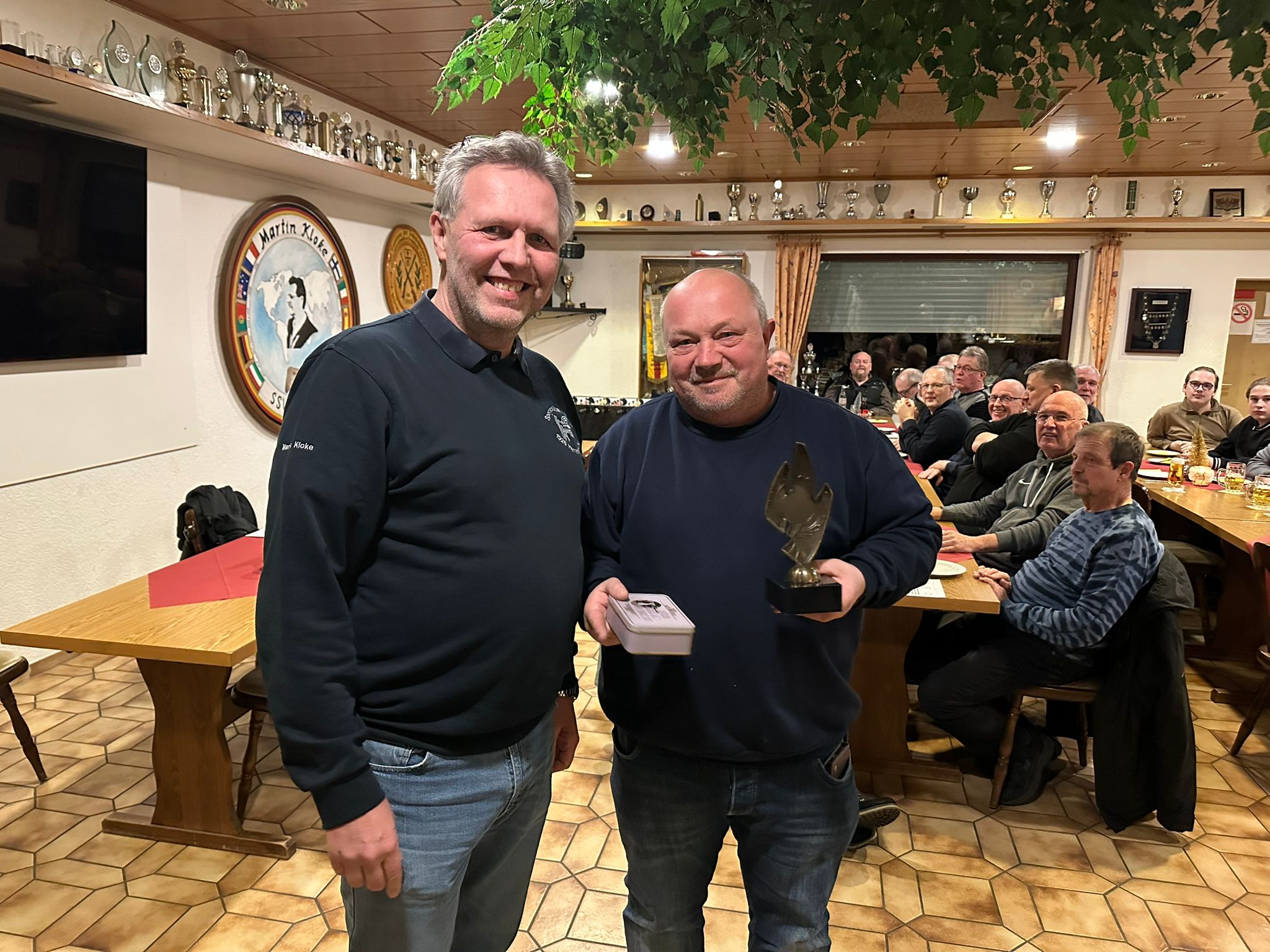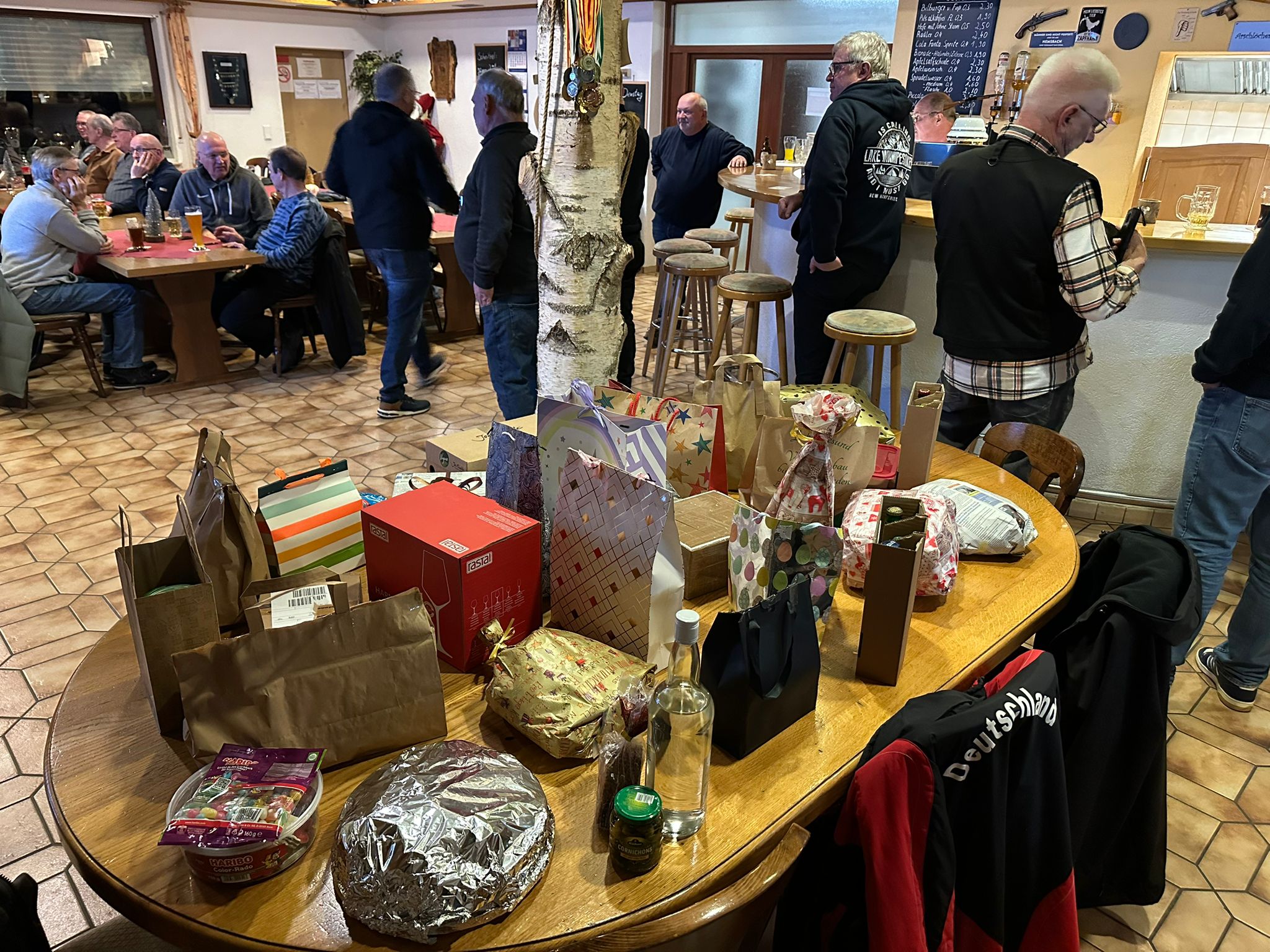 Die Punkte wurden von Obersportleiter Thomas Schmitt vorgelesen, der die Teilnehmer der Reihe nach aufrief, um sich ein Geschenk vom reich gedeckten Tisch auszusuchen. Bei der Gesamtpunktzahl hatte Martin Kloke die Nase vorn und durfte als Erster ein Geschenk auswählen, gefolgt von Holger Schleser und Christian Weithofer. Anschließend wurden die Mitbringsel gemeinsam genossen – ein schöner Abschluss des Abends.